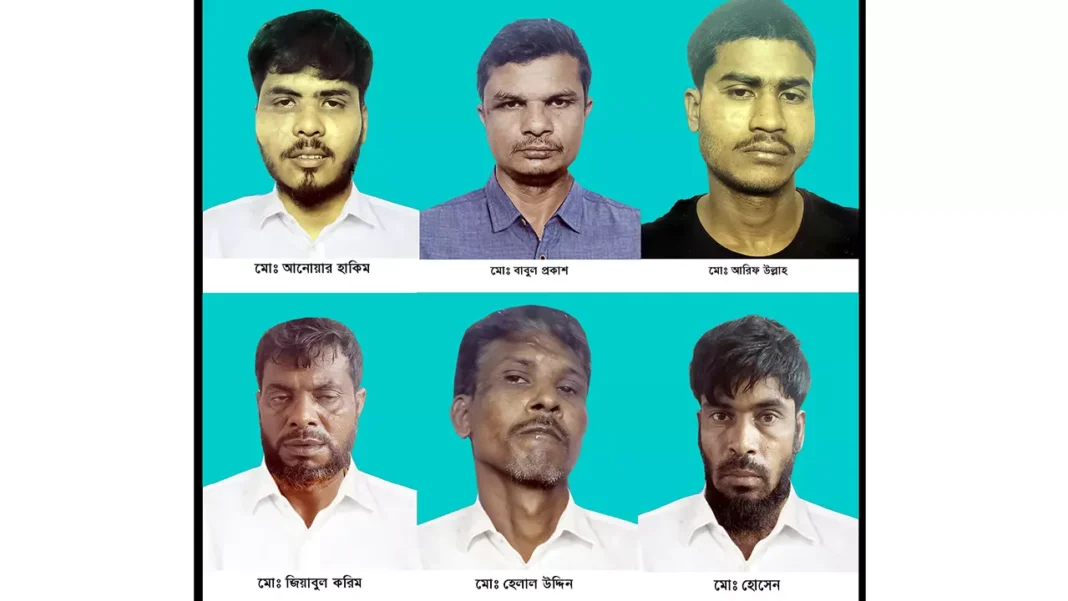 আটকরা হলেন- মো. বাবুল প্রকাশ (৪৪), মো. হেলাল উদ্দিন (৩৪), মো. আনোয়ার হাকিম (২৮), মো. আরিফ উল্লাহ (২৫), মো. জিয়াবুল করিম (৪৫) এবং মো. হোসেন (৩৯)।
