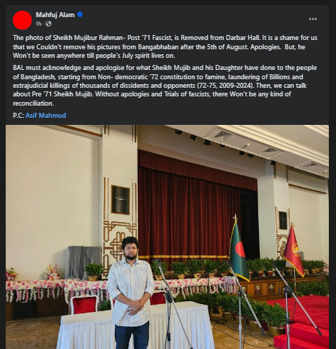 মাহফুজ আলম গতকাল রবিবার সন্ধ্যায় উপদেষ্টা হিসেবে শপথ নিলেও এখনও কোনো দপ্তরের দায়িত্ব পাননি। ফেসবুকে পোস্টে তিনি বলেন, “৭১-পরবর্তী ফ্যাসিস্ট শেখ মুজিবের ছবি দরবার হল থেকে সরানো হয়েছে। এটা আমাদের জন্য লজ্জার বিষয় যে ৫ আগস্টের পরও বঙ্গভবনে তার ছবি ছিল।”
