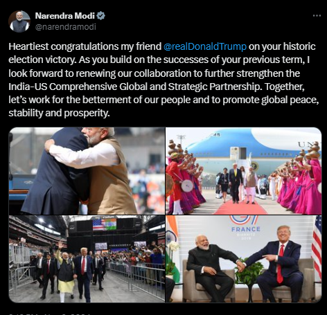 যুক্তরাষ্ট্রের ৪৭তম প্রেসিডেন্ট নির্বাচিত হওয়ার পথে ডোনাল্ড ট্রাম্প,তাই অভিনন্দন জানিয়েছেন ভারতের প্রধানমন্ত্রী নরেন্দ্র মোদি। তিনি ট্রাম্পকে ‘বন্ধু’ আখ্যা দিয়ে ভারত-মার্কিন সম্পর্ক আরও দৃঢ় করার আশা প্রকাশ করেন।