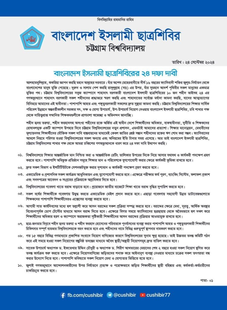 মঙ্গলবার (২৪ সেপ্টেম্বর) সন্ধ্যায় শাখা ছাত্রশিবিরের সভাপতি মো. নাহিদুল ইসলাম ও সাধারণ সম্পাদক মুহাম্মদ ইব্রাহীম সাক্ষরিত বিবৃতিতে দাবিগুলো জানানো হয়েছে।